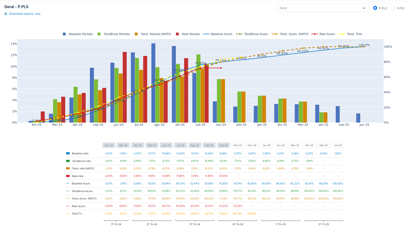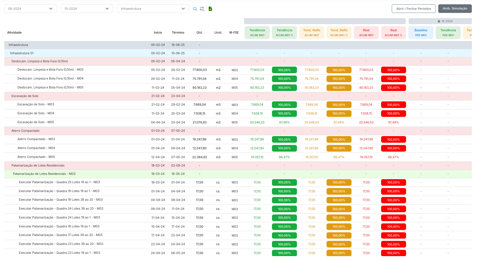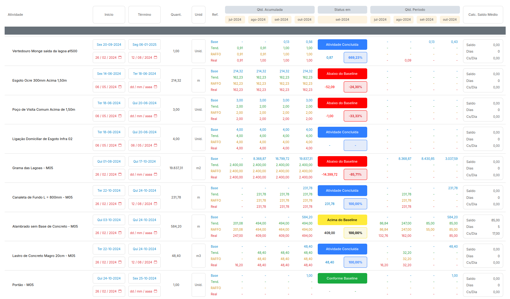Ferramenta para analise do avanço das atividades com relação ao baseline/tendência apontando desvio do realizado com relação ao período desejado.