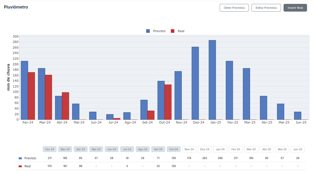O pluviômetro permite comparar a média histórica de chuvas do período com a quantidade real durante a obra. Com apenas um clique, você poderá obter todos os previstos para a cidade do empreendimento, com base em dados coletados e analisados nos últimos 30 anos, garantindo mais assertividade no planejamento da execução e reduzindo risco de imprevistos.
